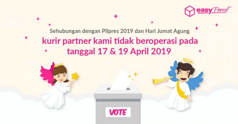 Sebentar lagi kita akan menyambut Pilpres 2019 dan Hari Jumat Agung. Dalam rangka hari libur nasional ini, kami ingin menginformasikan bahwa semua kurir partner kami tidak beroperasi pada 17 dan 19 April 2019 dengan keterangan sebagai berikut: